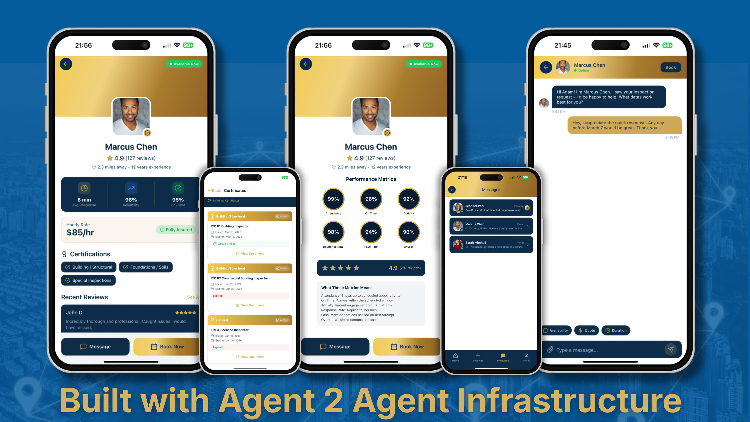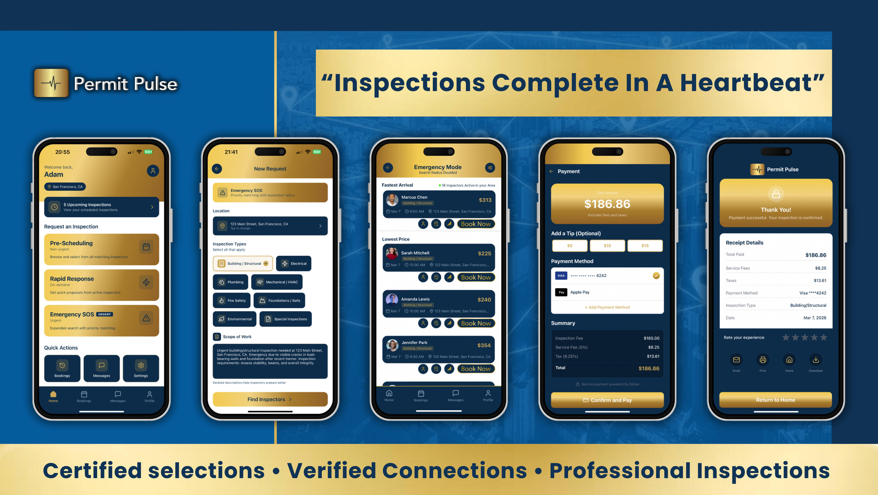 ∙ Emergency Mode: Doubles your search radius, priority-matches the fastest qualified inspectors available, and surfaces results on-demand with one-tap Accept and Quick Pay.∙ Rapid Response Mode: For contract-critical, time-sensitive, and progress-driven inspections. AI matches you to qualified inspectors with proposed dates, times, and pricing, ready to confirm fast.∙ Pre-Schedule Mode: Plan ahead, negotiate dates, times, and pricing through in-app messaging, with Quick Pay available when you’re ready.Every booking is saved automatically with full documentation, scope, outcome, receipts, and reminders, a permanent record for both sides.