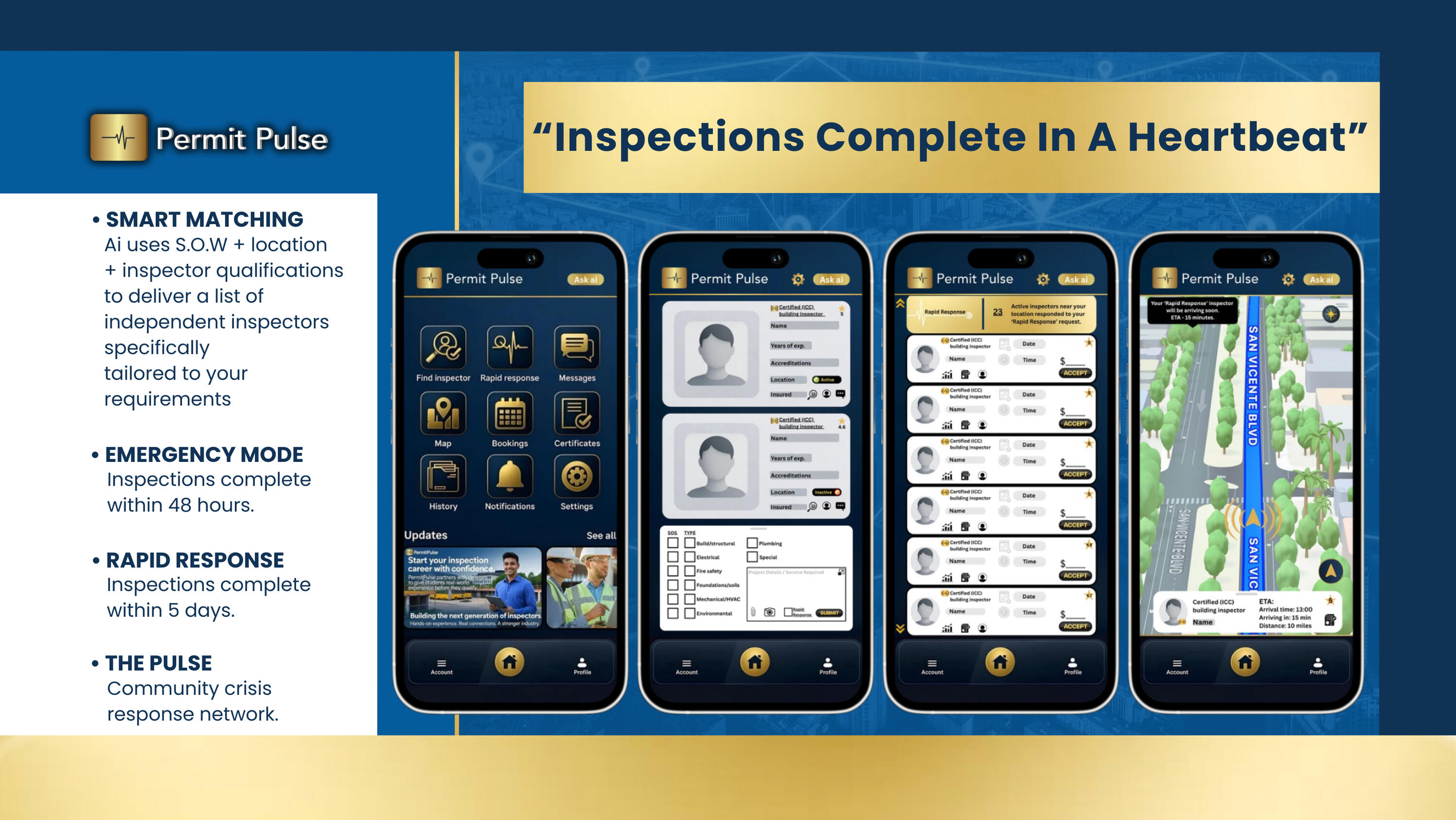 PermitPulse: The first app that instantly matches businesses and homeowners with certified independent inspectors specifically qualified for their exact inspection type, using AI, geolocation, and SOW analysis. Get Emergency Inspections within 48 hours, Rapid Response within 5 days, and support from our growing community crisis-response network: ‘The Pulse’.